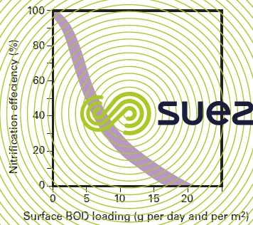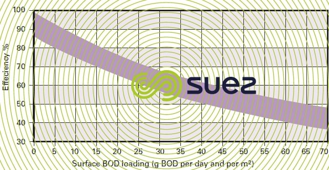 Figure 28 provides the estimated BOD removal efficiency according to the surface loading density applied. With a typical primary settlement urban wastewater, a surface loading density of approximately 5 g BOD · d–1·m–2 will produce a discharge having less than 30 mg · L–1 of BOD.