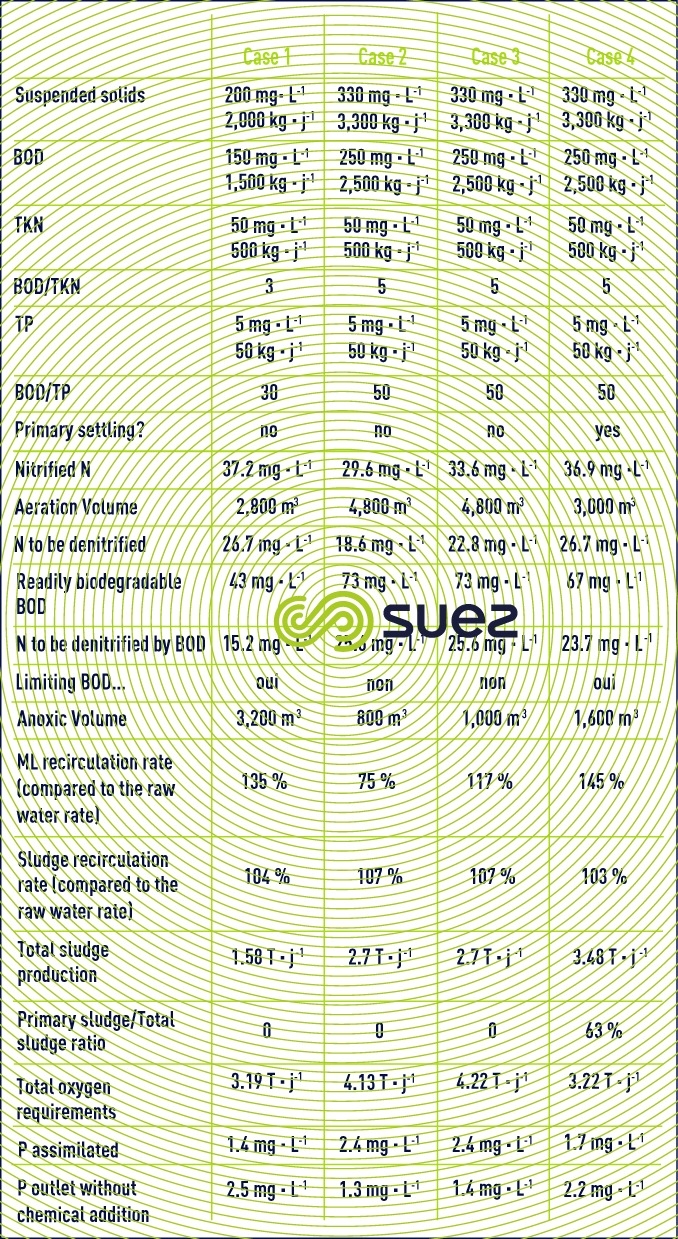 The following table provides several design examples for the same 10 000 m3·d–1 plant according to different scenario: more or less concentrated effluent, sludge returns taken into consideration, presence or absence of primary settling.