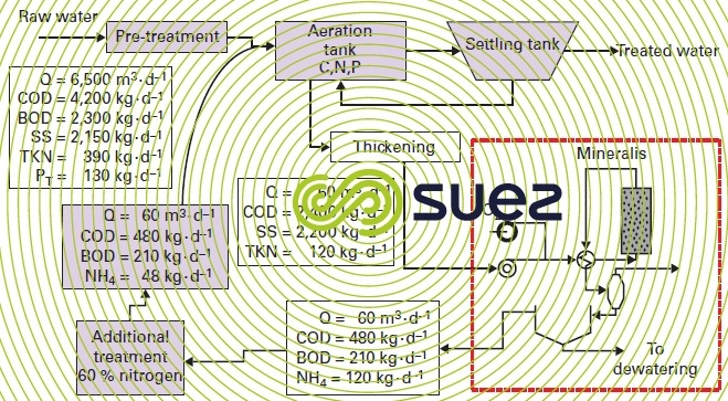 Figures 52 and 53 illustrate the Mineralis process in its external ammonia processing and catalytic reaction option and also its integration (materials balance) into a 40,000 PE wastewater treatment plant.
