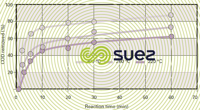 For a given type of sludge, temperature conditions will have a marked impact on COD removal efficiency (figure 47). Figure 48 highlights the fact that, with most sludge, there will be a 20 to 40 % COD removal improvement when the temperature is increased from 220 °C to 300 °C (subject to the same reaction time) and that, by working within this temperature range, the efficiency differential between the various sludges will be minor.