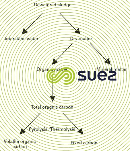 Figure 34 illustrates the origin of fixed carbon. Volatile organic carbon is the fraction of total organic carbon that is determined by the loss by weight at a temperature of 550 °C in a total absence of oxygen. When this breakdown occurs, a substrate remains; this substrate is made up of mineral matter and of a non volatile carbonaceous residue which is treated like mineral carbon.