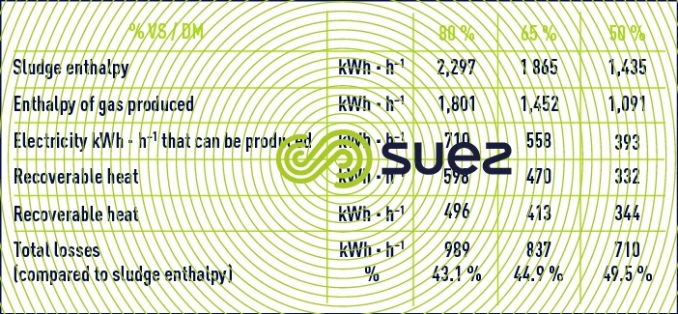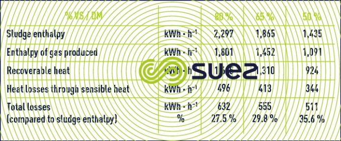 The overall energy balance applied to case n° 2 shows the effect of the sludge VM content on energy recycling in the case of co-generation (production of electricity and of residual heat – table 12) and on the recovery boiler (energy transferred to a heat exchange fluid – table 13).