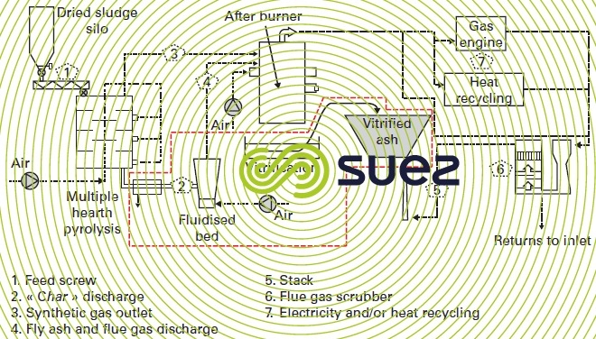 Similarly, the original process developed by Lurgi (LR process) is based on a reactor that is self-fluidised by the synthetic gas produced by dried sludge breakdown where the heat input is the sensible heat recovered from mineral ash generated by incinerating a mixture of ash and fixed C. This process comes up against the same problems as synthetic gas production and, as yet, has found no industrial application.