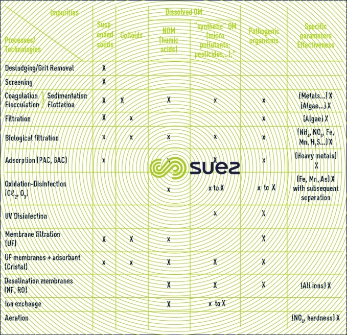 Therefore, to render water potable, there exists an entire range of technologies of which practically none are truly specific to any of the pollutant types referred to above. This is illustrated by table 1 where the X’s denote the processes thatplay a major role in the elimination of a particular type of contaminant and where x’s denote a process that contributes to said elimination but as a secondary property.