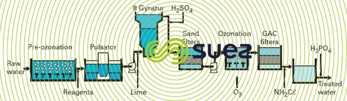 - at Villeneuve-la-Garenne (France), the plant already included nitrification followed by sand filtration; the plant was then refurbished by adding partial water softening with Gyrazur, after injecting lime slurry, and completing the treatment by adding a small amount of FeCℓ 3, dual media filtration, pH correction using H2SO4, ozonation and final chlorination for mains protection purposes ;