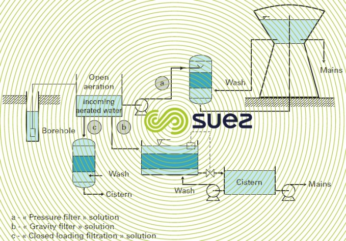 It is necessary to determine, on site, all of the water’s unstable properties after having operated the drilling in such a way as to ensure that the sample is representative. Accordingly, the following measurements are essential: temperature, pH, Redox potential, dissolved O2, available CO2, dissolved iron. On site or in the laboratory, the dissolved silica and OM (the two most frequent causes of complexation) concentrations need to be determined as well as the parameters likely to call for a treatment linked to or undertaken at the same time as iron removal (Mn, NH4,H2S, remineralisation…). It is also advisable to carry out an examination under the microscope in order to establish whether or not iron bacteria are present.