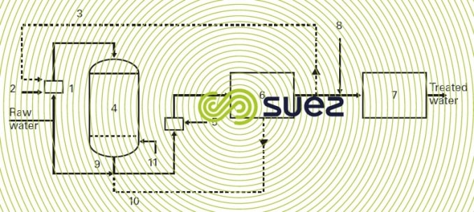 - if necessary, a tank for non-chlorinated backwash water (6) when raw water cannot be used for backwashing;