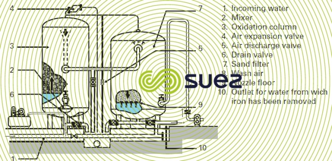 This process applies to groundwater having a maximum iron content of approximately 7 mg · L–1 and which, furthermore, is free of any other adverse properties: manganese, colour, turbidity, humic acids; low levels of ammonium and moderate carbonic attack are acceptable.