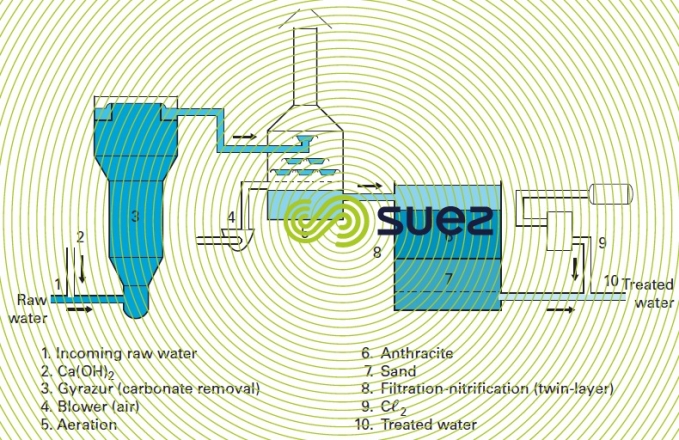 Partial carbonate removal at a pH in the region of 8 can, therefore, result in total iron removal. In some cases, especially in fluidised bed carbonate removal reactor (see section the gyrazur, a granular contact mass reactor), the same pH will produce satisfactory manganese removal whereas, in theory, the latter should be combined with total carbonate removal at a pH of 9.5 or 10. This is the principle used for the Ratingen plant in Germany (figure 27): this plant carries out partial carbonate removal, iron removal, manganese removal and nitrification.