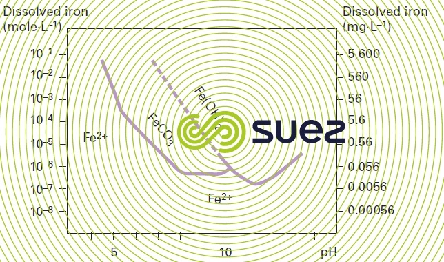 Free, it exists in its ionised form: Fe2+ as a rule or, more rarely, FeOH+ (pH > 8.3). In water having a notable TAC, the Fe2+ ion will mainly be found as a hydrogen carbonate (or bicarbonate) and its solubility, restricted by the carbonate precipitation which is only very slightly soluble, will obey the following:
