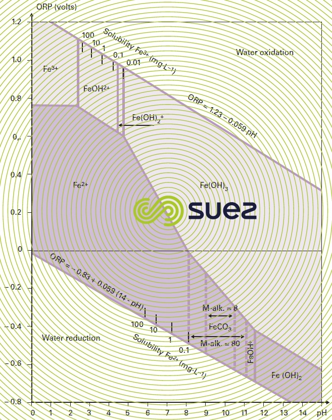 Therefore, in order to establish an iron removal treatment, it will not simply be enough to know the total iron content; we will also need to know the various forms in which this element is likely to be present (please refer to figure 20 for a summary of the different states in which iron is present in water) and this supposes that all the other parameters likely to affect this speciation are also known.
