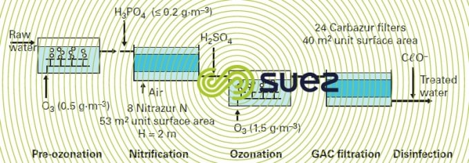 LFN in french) loaded with biolite is included; oxygen is injected into the water during a preliminary aeration step, either by cascade or by dissolution using porous diffusers. That applies to the “Eau & Force” plant at Mont Valérien, France
