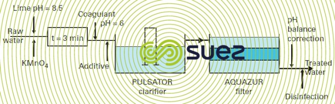 In soft, coloured surface water applications that contain high amounts of OM and that require total clarification using coagulation-flocculation and sedimentation (water from granite areas of primary massives, for instance), the relevant treatment system can be designed on the basis of the scheme shown in figure 32, constituting an alternative to the system referred to earlier using chlorine and a "manganised" filtration medium.