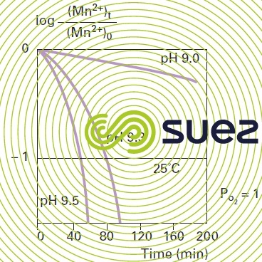 Oxidation using oxygen only reaches an appreciable rate when the pH rises above 9.5 (figure 31). Mn2+ oxidation using oxygen depends on temperature: oxidation will be 5 times faster when the temperature rises from 11°C to 22°C; however, at normal pH levels, contact times are not easily compatible with industrial operation.