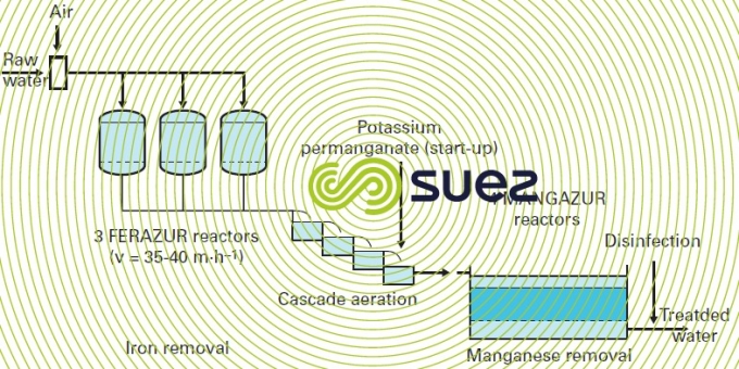 - a combined solution like the one for the Mommenhein (France) plant, outlined in figure 35: biological iron removal is carried out under pressure whereas biological manganese removal takes place by gravity: permanganate was injected into the cascade when the plant started up during the seeding process; seeding then occured very quickly, allowing the second stage filtration cycles to be extended from an average of 24 hours (during operation in physicalchemical mode) to 1-2 weeks (operation in biological mode).