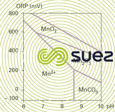 In order to grow, these bacteria require a relatively basic environement (pH > 7.5), where the EH must be higher than 400 mV (equivalent to water close to dissolved O2 saturation); please refer to figure 28 and biological manganese removal domain (2). On the other hand, should the redox potential decrease significantly, some of these bacteria will solubilise (MnO2, Mn2+ passage) the manganese that they had previously accumulated.