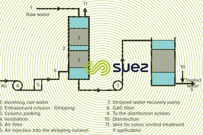 When a water’s organic contamination is caused solely by large quantities of volatile compounds (e.g. trichlorethylene, tetrachlorethylene, chloroform, carbon tetrachloride…), elimination by air stripping is an option. This applies to some aquifers. After stripping, polishing can be carried out by filtration through activated carbon as indicated in figure 42.
