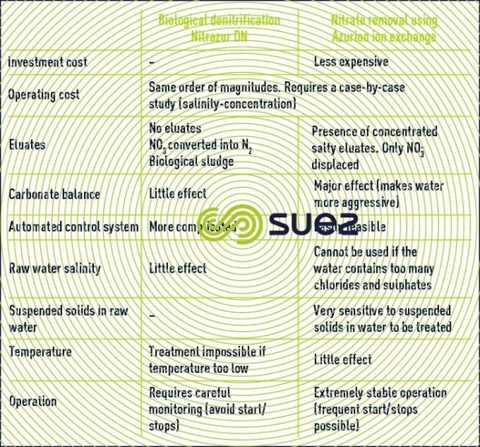 - composition of the water: in addition to NO3- ions, ion exchange removes SO42—ions and some HCO3- ions which are exchanged for Cℓ– ions when the resin is regenerated using sodium chloride. In treated water, this can lead to an excessively high concentration of Cℓ– ions. Operating with an HCO3–exchange can provide a solution but this solution will be more difficult and more costly to implement.