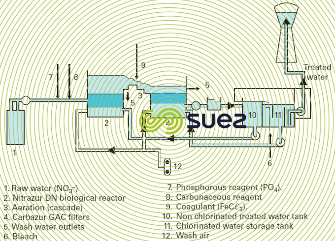 In addition to the carbonaceous nutrient, phosphorous also has to be added at the intake (approximately 0.5 g of PO43– to eliminate 100 g of nitrates) as this is essential to bacterial development. Optimum pH will be in the region of 7.5.
