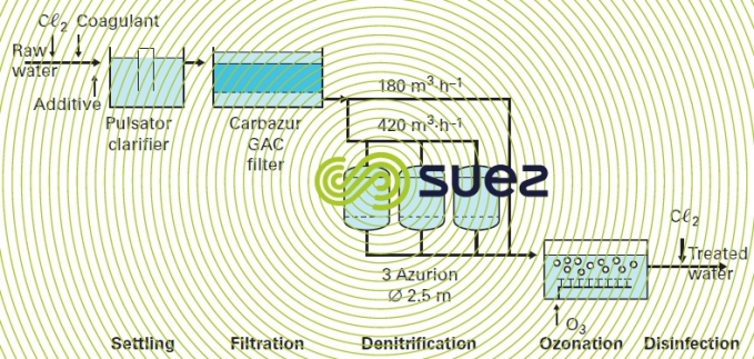 An illustration of the Azurion process application is provided by the Rest DWTP at Plouenan (France) that processes surface water on behalf of the Horn water board. Figure 38 provides a schematic diagram of the treatment train. An additional installation is illustrated in photo 24.