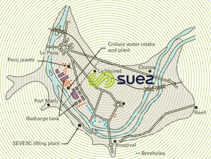 This technique requires a geologically isolated water table that is supplied from a well-known natural source. The Croissy-sur-Seine, (France) aquifer is a good example (figure 17). The draining zone is made up of white senonian chalk, with fissures over a depth of several tens of metres and covered with recent alluvia (sand and gravel). It is fed naturally by: