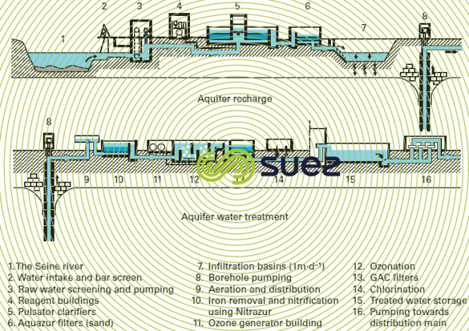 - ensure the availability of a large reserve of good quality water; the aquifer acts like a reservoir and recharging only takes place when the quality of the raw water is acceptable. Recharging is suspended if abnormal contamination occurs,