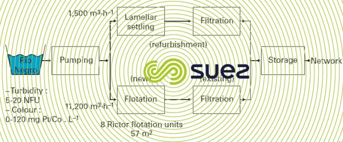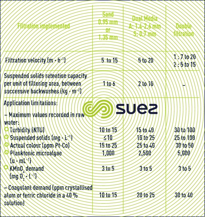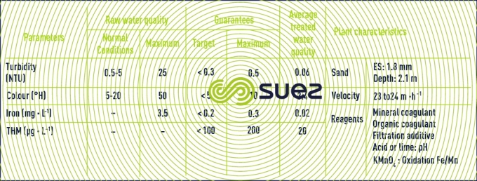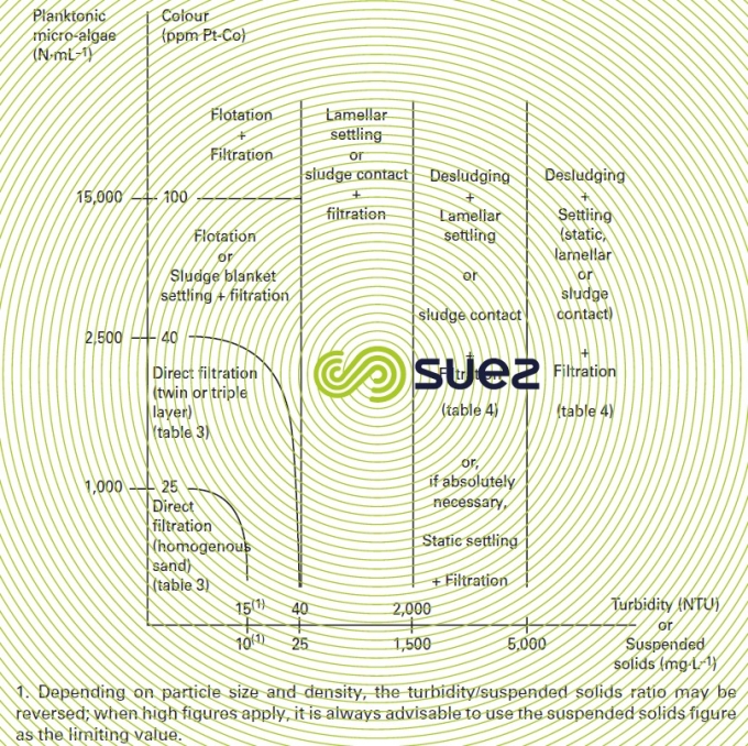 This treatment approach must be applied to all waters where turbidity, colour, suspended solids, algae and oxidability properties exceed the figures quoted in table 3 without, however containing significant pollution (close to the A2 quality according to French decree 2001-1220, appendix 1 – 3).
