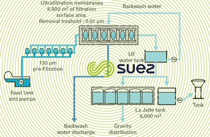 This type of plant (photo 3) is perfectly adapted for a karstic water source, lake water supply and limited capacity as it produces water that always satisfies the most stringent microbiological and turbidity standards without the need for highly qualified personnel on site. Easily automated, these systems are controlled by a turbidity meter and can automatically transfer from dead-end filtration (normal operation withlow turbidity) to tangential filtration (during turbidity peaks), see membrane separation, systems using clarification membranes and ucd (degremont® compact unit).