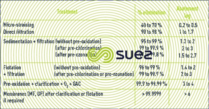In a conventional plant, recycling of the filter backwash water (see section sludge processing) constitutes a potential risk: the above values show that, in order to avoid increased oocyst levels, this type of water has to be treated with a removal potential of at least 2 logs.