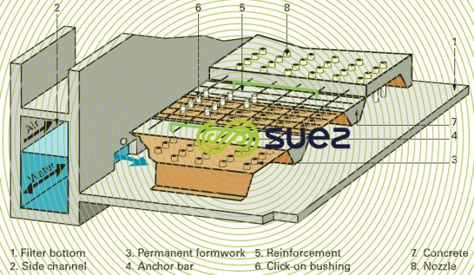 When access beneath the floor is not required, the floor can be positioned in the bottom of the filter. The Azurfloor floor (figure 5) is a concrete floor that is cast on permanent formwork that is laid direct on the filter floor. Equipped with the same nozzles as other degremont® floors, the Azurfloor has the same hydraulic properties. The Azurfloor has the advantage of being very easy to install and is totally free of any seal. Its modular construction and shallow depth make it ideally suited to the refurbishment market.