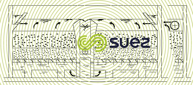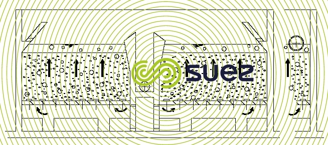 - water only rinse, at high speed, designed to expand the filter bed, to flush out the impurities dispersed throughout its depth using scour air, and to regrade the media; in the case of the Médiazur BV filters, this wash phase takes place as water to be filtered is fed through the feed channels for the purpose of crosswashing the surface, thereby accelerating the removal of impurities.