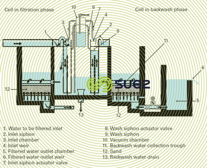 The wash water, supplied from the general filtered water tank, then backflows through the filter media and is collected by a trough (11) before passing through a siphon (9) for discharge to the drains (13).