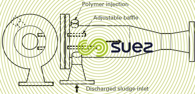 This cyclonic type mixer is ideal for sludge conditioning (figure 3). It comprises a cylindrical section which receives incoming sludge and the reagents, followed by a conical section in which thorough mixing takes place in a spinning motion. The cylindrical section comprises two adjustable baffles.