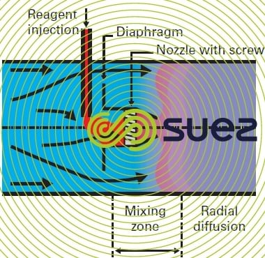This is a hydraulic radial diffusion mixer used to inject mineral reagents, polymers… It comprises a nozzle centred along the pipeline's axis and a plate with peripheral apertures (figure 2).