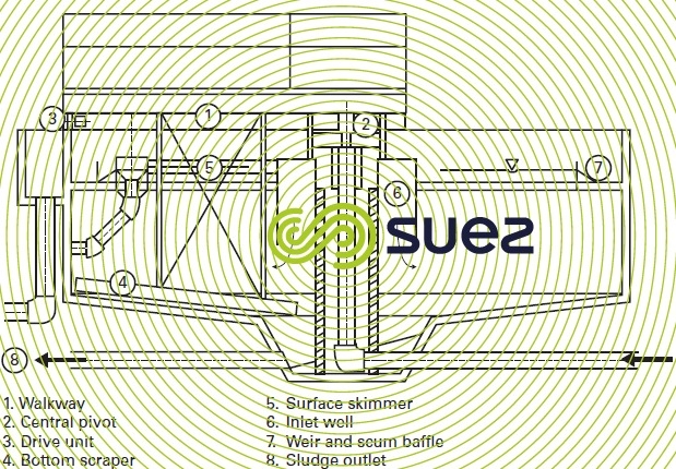 On the other hand, suction sludge collection is ideally suited to the larger structures: sludge contact time is controlled and the structure depth limited because the floor is horizontal. In practice, suction clarifiers are preferred to the scraped alternative for diameters over approximately 25 m. In effect, for 25 to 35 m diameters, SUEZ offers an interesting compromise, the Racsuc.
