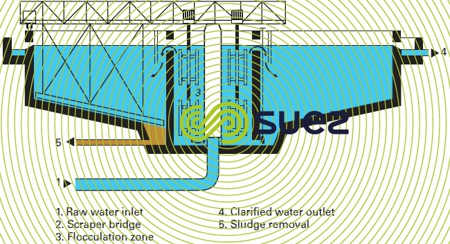 - in very heavily laden water, during the first settling stage (desludging) prior to the main solids contact clarification, preferably after high velocity gradient coagulation using a cationic polymer (when the use of these products is authorised) or an anionic polymer depending on the raw water suspended solids content (see clarification) and by selected scraped type units;