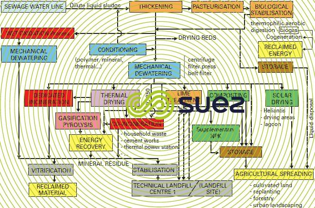 Note: when thorough removal of pathogenic germs is a requirement (sanitisation), this can be achieved with some of the classic stages (two-phase anaerobic digestion, Naratherm drying for instance); however, specific stages will be required (pasteurisation, massive lime treatment, for instance).