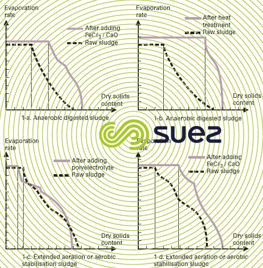 Of the various processes used, heat conditioning (figure 13-1b) is by far the most efficient to reduce the hydrophilic force of the particules (increased aw for an identical initial water content). Chemical flocculation that uses mineral electrolytes (especially lime and metal salts) also reduces, but to a lower extent, the amount of bound water (figure 13-1a, 1d).The use of polyelectrolytes, however, only induces a slight drop in this bound water level (figure 13-1c) and may even increase it. Consequently, the type of conditioning used will affect the dry solids content of the sediment obtained.