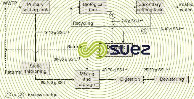 - eliminating thickeners downstream from biological stabilisation processes and, consequently reducing the amount of pollution returned to the head of the plant;