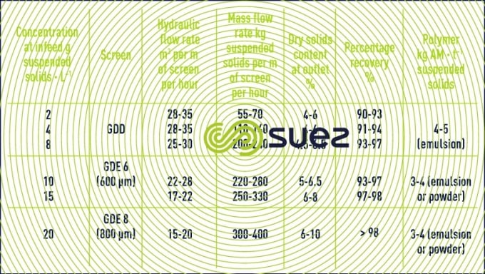 - polymer:5 kg·t–1 suspended solids, 20 to 40 kg suspended solids·m–2·h–1 loading;