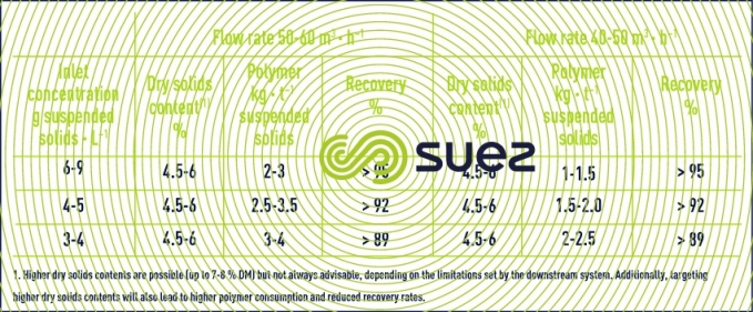 For example, for WWTP biological sludge, table 3 provides some performance figures for a machine having a ∅ 500-550 mm diameter bowl and an LT/∅ ratio of more than 4 (sludge with SVI< 150 and less than 75 % of VS).