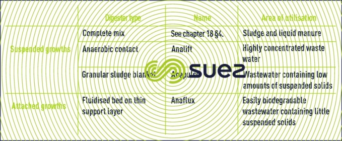 Over the past 30 years, various technologies have been developed by SUEZ, including techniques by suspended growth or by attached growth, (Table 1). These equipments are known as either digesters or methane fermentation units.