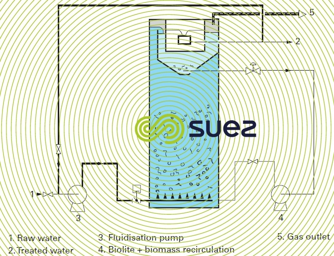 In order to ensure a good fluidisation of the medium, a velocity of 5 to 10 m · h–1 must be maintained; the process usually requiring effluent recycling. The mixture is evenly distributed throughout the reactor; a three-phase separator located in the upper section of the reactor is used to release gas and to recover and recycle any entrained biolite (carried by biogas bubbles attached to the film).