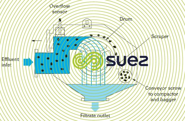 Water crosses through the strainer while the solids are held back, carried away by the cylinder’s rotation and then removed.