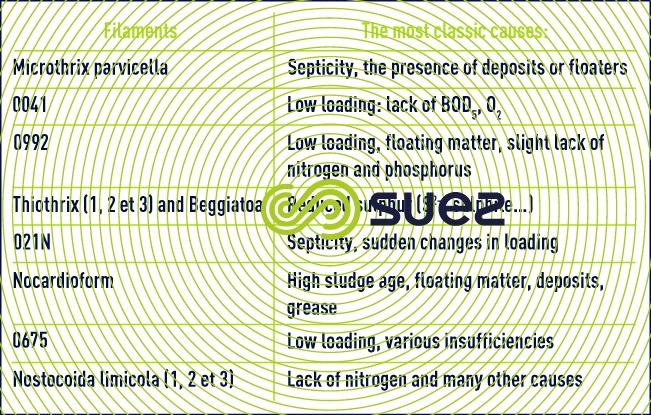 In the same way, the presence of certain compounds and, above all, environmental parameters can enhance the development of filamentous bacteria and/oractinomycetes that impede sedimentation (the bulking phenomenon) and/or create "biological disorders". Table 8 contains the main filamentous forms.