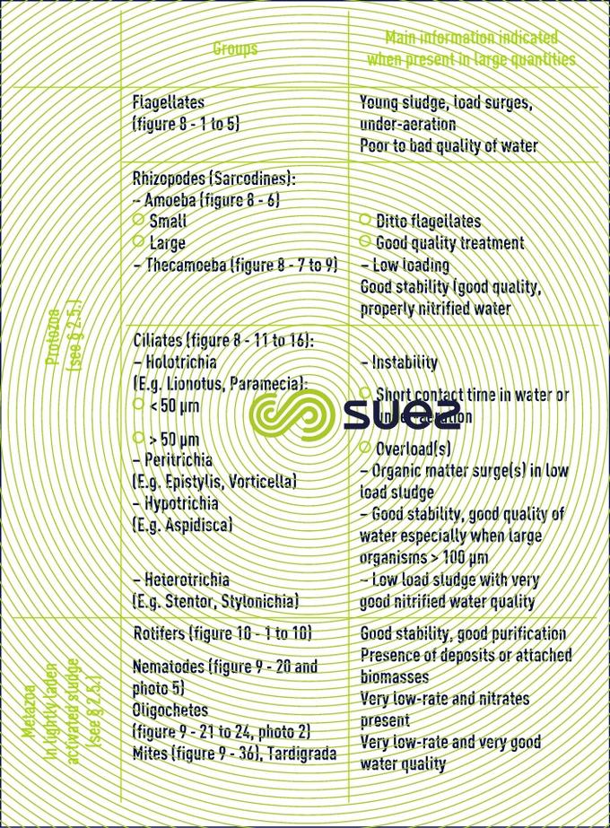 As an example, table 9 contains a list of the main "animals" found in activated sludge, together with the information that may be obtained by observing the proliferation of a given group or species.