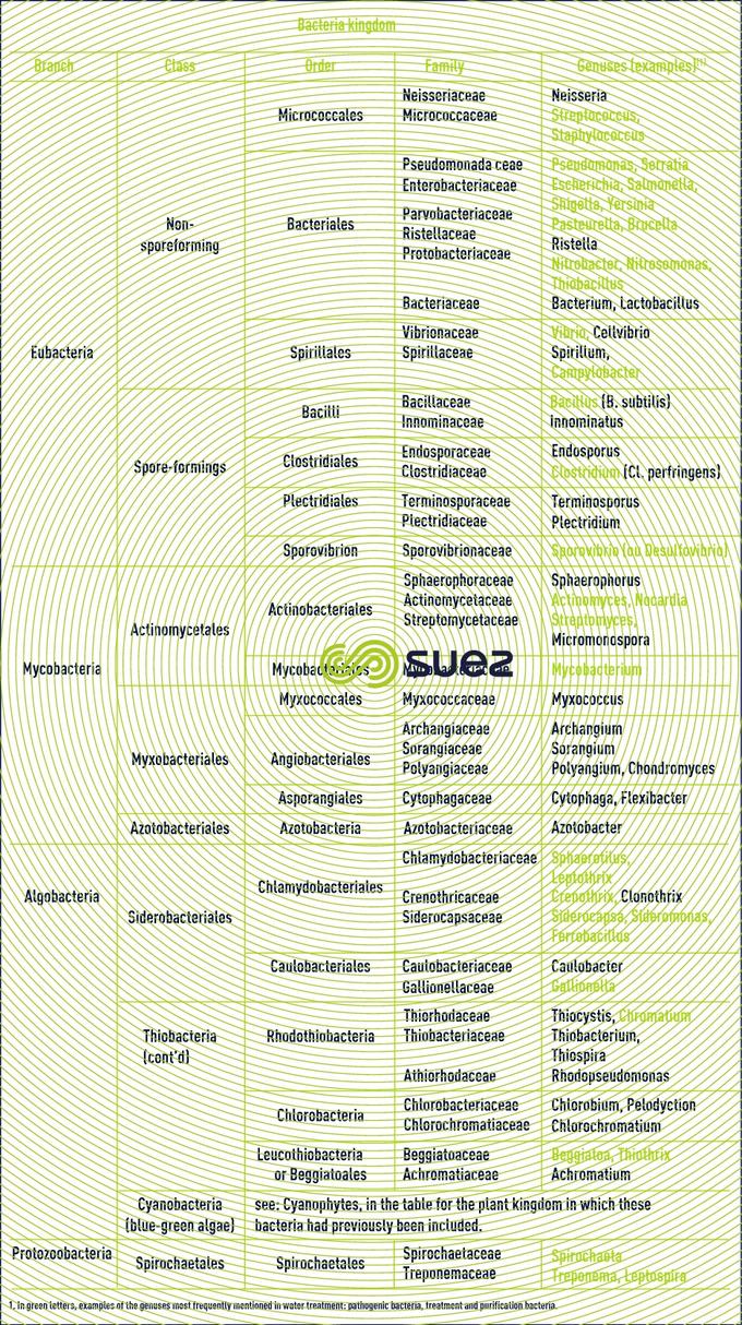 Reading time:This kingdom comprises isolated or colony-forming, single cell microscopic organisms. We saw earlier how its prokaryote properties distinguished it from the two following kingdoms (plant and animal); however, bacteria also have affinities with each of these two kingdoms; in effect, the bacteria classification put forward here (Prévot, 1961) (table 3), actually includes four divisions: alongside true bacteria (Eubacteria), the other three have a degree of analogy with either fungi (Mycobacteria) or algae (Algobacteria) or with some single cell animals or protozoa (Pro¬tozoobacteria). Figure 1 (see micro-organisms for which freshwater is their natural habitat) illustrates the polymorphism of the bacteria kingdom.
