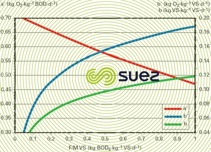 Therefore, the age of the sludge will be in inverse proportion to the F/M ratio. This concept of sludge age is particularly important because it is indicative of the physiological condition of the micro-organisms: the respiratory coefficients a’ and b’ examined above are closely correlated to the age of the sludge (figure 11). Furthermore, the presence or absence of nitrifying germs will be conditional on sludge age (see suspended growth (activated sludge) process).