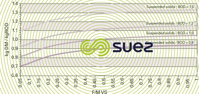 In UWW biological purification applications, the curves shown in figure 10 provide a rough approximation of biological sludge production by a system at a temperature close to 15°C, based and F/M r SS / BOD ratios.