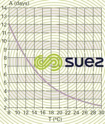 Leaching is very temperature-dependant. Under pH conditions of between 7.2 and 8, the link between the minimum age of aerated sludge required to maintain stable nitrification and temperature is shown by the curve in figure 13.